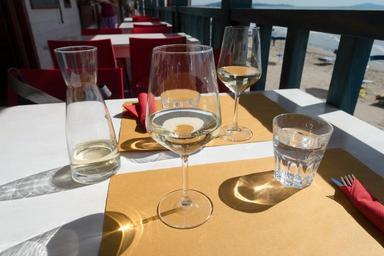 Keywords: cover wine white wine mineral water cutlery napkin red lunch break eat benefit from drink liquid clear beach sea restaurant