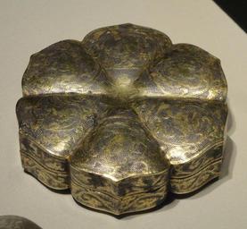 | Keywords: Covered box in form of a flower, view 1, probably Chang'an, Shaanxi province, China, early to mid Tang dynasty, late 7th-early 8th century AD, hammered silver - Freer Gallery of Art - DSC05607.JPG en Exhibit in the Freer Gallery of Art Washington DC USA This artwork is old enough so that it is in the public domain Photography was permitted in the museum without restriction 2013-02-12 15 58 42 own Daderot cc-zero Metalwork of China in the Freer Gallery of Art Uploaded with UploadWizard Metalwork of the Tang Dynasty |