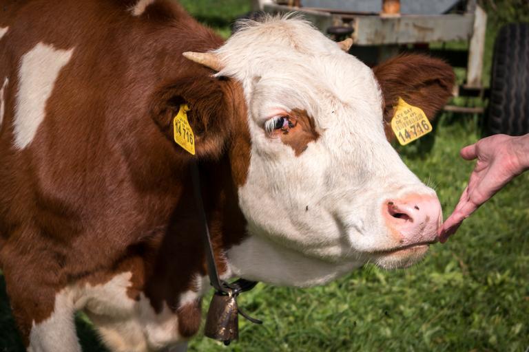 Keywords: cow hand head fur eye face dear alm pasture meadow mountains alpine portrait bavaria germany