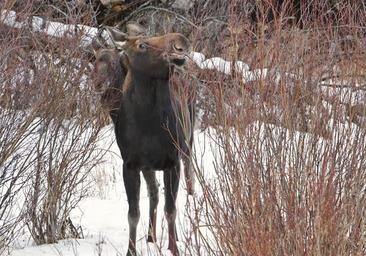 Keywords: outdoor animal Cow moose browsing on willows; Jim Peaco; December 2014; IMG_0370 Cow moose browsing on willows; Jim Peaco; December 2014; IMG_0370