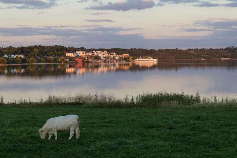 Keywords: cow pasture graze bank lake recovery rest ship city town abendstimmung