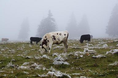 Keywords: cow pasture winter creux du van animals cattle alm graze land agriculture calf eat meat raw fog weather swing autumn firs