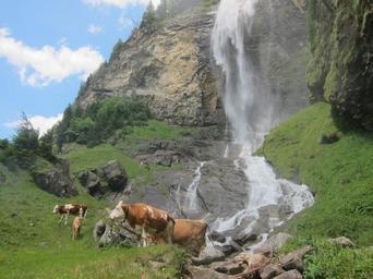 Keywords: cow waterfall alm austria livestock pasture agriculture cows cliff mountains