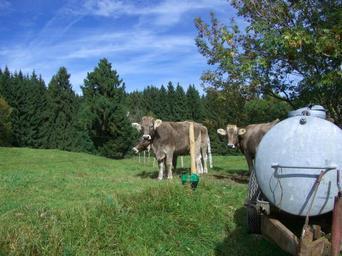 Keywords: cow young cattle beef water tank pasture forest meadow sky blue allgäu