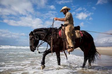 Keywords: cowboy horse riding water ocean beach cross country ride usa west male man rope portrait equestrian rider