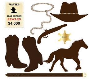 Keywords: cowboy boots hat horse wanted poster cowboy hat cowboy boots clip-art scrapbooking lasso rope gun pistol revolver icons elements illustration