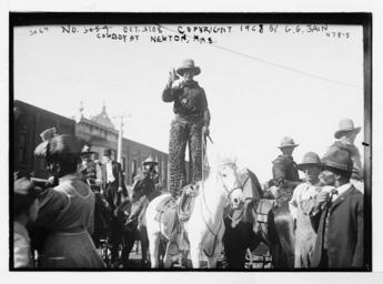 | Keywords: Cowboy standing in saddle on horse, Newton, Mass.jpg Uploaded with en wp UW marker 2013 05 07 Cowboy standing in saddle on horse Newton Mass Creator s Bain News Service publisher Date Created/Published 1908 date created or published later by Bain Medium 1 negative glass ; 5 x 7 in or smaller Reproduction Number LC-DIG-ggbain-02249 digital file from original neg Rights Advisory No known restrictions on publication Call Number LC-B2- 478-5 P P Repository Library of Congress Prints and Photographs Division Washington D C 20540 USA http //www loc gov/pictures/item/ggb2004002249/ Library of Congress http //www loc gov/rr/print/195_copr html Library of Congress Newton Massachusetts |