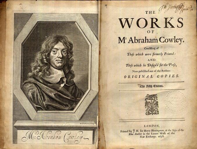 Keywords: CowleyWorks+Frontis copy.jpg Frontispiece and Titlepage to the 1678 Edition of the Collected Works of Abraham Cowley Private Collection of S Whitehead 2007-10-26 Abraham Cowley PD-old Check categories 2008 November 12 en wikipedia Abraham_Cowley ja wikipedia エイブラハム・カウリー Abraham Cowley |