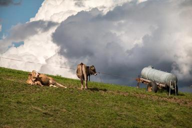 Keywords: cows clouds pasture sky cumulus clouds cumulus graze rest alm green meadow mood water tank tank wagon alpine allgäu schönegger käse-alm schönegger alm mountain meadow germany bavaria