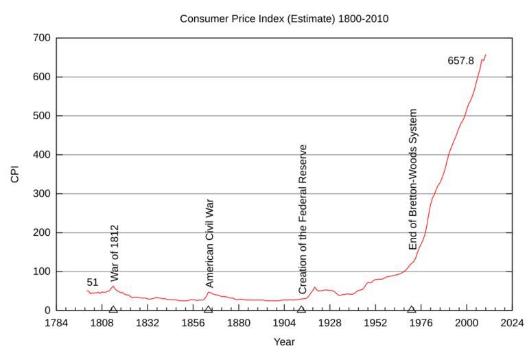 | Keywords: Cpi-2010.svg en The United States Consumer Price Index from 1800 through 2010 http //www minneapolisfed org/Research/data/us/calc/hist1800 cfm and http //upload wikimedia org/wikipedia/commons/8/88/USACPI1800 svg Aoss with work from Nkocharh 2010-08-28 In the public domain http //upload wikimedia org/wikipedia/commons/8/88/USACPI1800 svg My gnuplot setup file <pre>set terminal svg enhanced fsize 12 size 750 500 set output 'gnuplot-cpi-output svg' set datafile separator \t set style data lines set title Consumer Price Index Estimate 1800-2010 set nokey set xdata time set format x Y set timefmt Y set xtics nomirror set noy2tics set xlabel Year set ylabel CPI set grid noxtics set grid ytics Label for the creation of the Fed You shouldn't need to change this set label 1 Creation of the Federal Reserve at 1913 1 rotate point pointtype 8 offset -0 3 1 Label for the initial CPI You shouldn't need to change this set label 2 51 at 1800 1 offset first 0 71 Label for the War of 1812 You shouldn't need to change this set label 3 War of 1812 at 1814 1 rotate point pointtype 8 offset -0 3 2 Label for the Civil War You shouldn't need to change this set label 4 American Civil War at 1864 1 rotate point pointtype 8 offset -0 3 1 5 Label for Bretton-Woods You shouldn't need to change this set label 5 End of Bretton-Woods System at 1971 1 rotate point pointtype 8 offset -0 3 4 5 Label for the current CPI You need to change this Looks like the offset's y needs to be about 20 more than the CPI value we're labeling set label 6 657 8 at 1990 1 offset first 0 640 plot 'cpidata dat' using 1 2</pre> My cpidata dat data file <pre> Consumer Price Index Estimate Data taken from http //www minneapolisfed org/Research/data/us/calc/hist1800 cfm on 28 August 2010 Year CPI 1800 51 1801 50 1802 43 1803 45 1804 45 1805 45 1806 47 1807 44 1808 48 1809 47 1810 47 1811 50 1812 51 1813 58 1814 63 1815 55 1816 51 1817 48 1818 46 1819 46 1820 42 1821 40 1822 40 1823 36 1824 33 1825 34 1826 34 1827 34 1828 33 1829 32 1830 32 1831 32 1832 30 1833 29 1834 30 1835 31 1836 33 1837 34 1838 32 1839 32 1840 30 1841 31 1842 29 1843 28 1844 28 1845 28 1846 27 1847 28 1848 26 1849 25 1850 25 1851 25 1852 25 1853 25 1854 27 1855 28 1856 27 1857 28 1858 26 1859 27 1860 27 1861 27 1862 30 1863 37 1864 47 1865 46 1866 44 1867 42 1868 40 1869 40 1870 38 1871 36 1872 36 1873 36 1874 34 1875 33 1876 32 1877 32 1878 29 1879 28 1880 29 1881 29 1882 29 1883 28 1884 27 1885 27 1886 27 1887 27 1888 27 1889 27 1890 27 1891 27 1892 27 1893 27 1894 26 1895 25 1896 25 1897 25 1898 25 1899 25 1900 25 1901 25 1902 26 1903 27 1904 27 1905 27 1906 27 1907 28 1908 27 1909 27 1910 28 1911 28 1912 29 1913 29 7 1914 30 1 1915 30 4 1916 32 7 1917 38 4 1918 45 1 1919 51 8 1920 60 0 1921 53 6 1922 50 2 1923 51 1 1924 51 2 1925 52 5 1926 53 0 1927 52 0 1928 51 3 1929 51 3 1930 50 0 1931 45 6 1932 40 9 1933 38 8 1934 40 1 1935 41 1 1936 41 5 1937 43 0 1938 42 2 1939 41 6 1940 42 0 1941 44 1 1942 48 8 1943 51 8 1944 52 7 1945 53 9 1946 58 5 1947 66 9 1948 72 1 1949 71 4 1950 72 1 1951 77 8 1952 79 5 1953 80 1 1954 80 5 1955 80 2 1956 81 4 1957 84 3 1958 86 6 1959 87 3 1960 88 7 1961 89 6 1962 90 6 1963 91 7 1964 92 9 1965 94 5 1966 97 2 1967 100 0 1968 104 2 1969 109 8 1970 116 3 1971 121 3 1972 125 3 1973 133 1 1974 147 7 1975 161 2 1976 170 5 1977 181 5 1978 195 4 1979 217 4 1980 246 8 1981 272 4 1982 289 1 1983 298 4 1984 311 1 1985 322 2 1986 328 4 1987 340 4 1988 354 3 1989 371 3 1990 391 4 1991 408 0 1992 420 3 1993 432 7 1994 444 0 1995 456 5 1996 469 9 1997 480 8 1998 488 3 1999 499 1 2000 515 8 2001 530 1 2002 538 8 2003 551 0 2004 565 7 2005 584 8 2006 603 5 2007 620 7 2008 644 4 2009 642 2 2010 657 8</pre> cc-zero Inflation graphs Consumer price index |