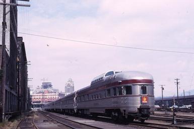| Keywords: outdoor train vehicle railroad Canadian Pacific Railway passenger train 'The Canadian', Vancouver Waterfront, Vancouver, BC in July 1965. The Canadian was officially launched as the flagship transcontinental passenger train by the Canadian Pacific Railway on 24 April 1955. It was designated as Train No. 1 (from Toronto) and 11 (from Montreal via Ottawa) going westbound to Vancouver and Train No. 2 (to Toronto), and 12 (to Montreal via Ottawa) going eastbound. The two sections join and split in Sudbury, Ontario and the train travels through Thunder Bay, Winnipeg, Regina, Calgary, and Banff. It was the first all stainless steel dome streamliner in Canada featuring stainless equipment built by the Budd Company. These stainless steel cars are still in use today on The Canadian, Via Rail Train No. 1 and 2. However, with the decline in passenger ridership in the 1970s, the Canadian Pacific Railway removed itself from the passenger rail market as the Federal Government formed the Crown corporation-Via Rail Canada in 1978, which assumed all responsibilities for CPR's passenger services. Despite the name, The Canadian today is routed through the Canadian National mainline via Sioux-Lookout, Winnipeg, Saskatoon, Edmonton, and Jasper formerly used by The Super Continental, former Canadian National Train No. 1 and 2, and former Via Rail Train No. 3 and 4. The only things preserved from The Canadian were merely the name and the stainless steel equipment. Source: www.google.ca/imgres?imgurl=http://www.railpictures.net/i... Canadian Pacific Railway passenger train 'The Canadian', Vancouver Waterfront, Vancouver, BC in July 1965. The Canadian was officially launched as the flagship transcontinental passenger train by the Canadian Pacific Railway on 24 April 1955. It was designated as Train No. 1 (from Toronto) and 11 (from Montreal via Ottawa) going westbound to Vancouver and Train No. 2 (to Toronto), and 12 (to Montreal via Ottawa) going eastbound. The two sections join and split in Sudbury, Ontario and the train travels through Thunder Bay, Winnipeg, Regina, Calgary, and Banff. It was the first all stainless steel dome streamliner in Canada featuring stainless equipment built by the Budd Company. These stainless steel cars are still in use today on The Canadian, Via Rail Train No. 1 and 2. However, with the decline in passenger ridership in the 1970s, the Canadian Pacific Railway removed itself from the passenger rail market as the Federal Government formed the Crown corporation-Via Rail Canada in 1978, which assumed all responsibilities for CPR's passenger services. Despite the name, The Canadian today is routed through the Canadian National mainline via Sioux-Lookout, Winnipeg, Saskatoon, Edmonton, and Jasper formerly used by The Super Continental, former Canadian National Train No. 1 and 2, and former Via Rail Train No. 3 and 4. The only things preserved from The Canadian were merely the name and the stainless steel equipment. Source: www.google.ca/imgres?imgurl=http://www.railpictures.net/i... |