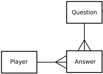 | Keywords: CPT-Databases-Exercise-PlayerAnswerQuestion.svg en A ER diagram showing A player answers many questions A question can be answered many times Each answer is only applicable to one question A player can give many answers Each answer has only only player contributing own Pluke 2011-05-15 Cc-zero Entity-relationship models Database models |