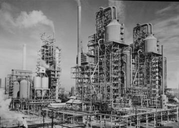 | Keywords: Cracker USA 1944.png en America's petroleum industries pour out fuel and lubricants for the United Nations These three new catalytic oil cracking units are turning out gasoline for the new machines of war at the plant of a large U S refining company in the southern U S state of Louisiana In the eight years of the development of the cracking process in producing gasoline it is estimated that 1 000 000 000 barrels of crude oil have been saved by the oil industry The cracking process subjects crude oil to heat and pressure by which the oil molecules are broken down and made to release more of their derivable elements The drain of war on such gasoline producing units as these is shown by the fact that the U S has manufactured 180 000 planes since December 7 1941 propelled by gasoline motors For example one U S Liberator four-motored bomber in a six-hour bombing run consumes 1 800 gallons of gasoline enough to last the average U S civilian motorist from three to five years LOC-image fsa 8e06335 pnp 1944 FSA PD-USGov Fluid Catalytic Cracker Louisiana in the 1940s |