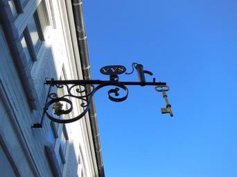 Keywords: craftsman signs shop signs plumbing old-fashioned water pump key black wrought iron blue sky white house front blue white