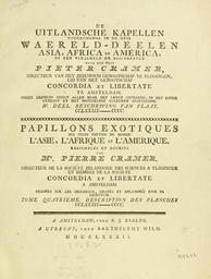 | Keywords: CramerAndStoll-uitlandsche kapellen vol. 4- 00 - title page deel IV.jpg Title page volume 4 De uitlandsche kapellen voorkomende in de drie waereld-deelen Asia Africa en America IV deel Papillons exotiques des trois parties du monde l'Asie l'Afrique et l'Amérique tome quatrieme <br/> Biodiversity Heritage Library http //www biodiversitylibrary org/item/95058 page/5/mode/1up 1782 Pieter Cramer 1721 - 1776 and Caspar Stoll between 1725 and 1730 - 1791 PD-old-auto 1791 Cramer and Stoll De uitlandsche kapellen volume 4 |