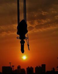 Keywords: crane hook sunset skyline city silhouette industry construction equipment heavy industrial lift tool cable machinery engineering work