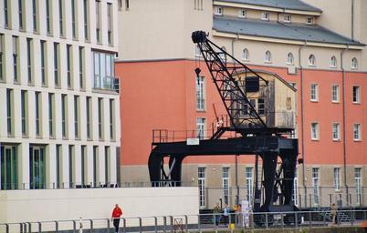Keywords: crane kranhaus lifting crane architecture building home window facade modern germany harbour area city cologne loading crane port rhine harbor