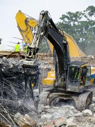 Keywords: crash demolition destroyed ruin collapse destruction excavators tear off disassembly site building rubble overburden concrete steel bridge building earthquake misfortune workers construction machine force search