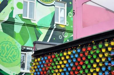 Keywords: creative artistic design building architecture exterior art district art district area flacon moscow russia colored flower pot flowers pots wall graffiti colorful creativity