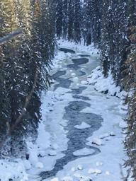 Keywords: creek frozen ice winter landscape mountains forest trees fir snow cold season nature frost white blue sky sunny day scenic river canyon idyllic
