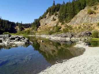Keywords: creek water placid scenery calm landscape nature rock hill vegetation reflection