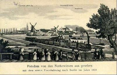 Keywords: Crelle Bahn 1839.jpg Image Crelle Bahn 1839 jpg First train from Potsdam to Berlin 1839 Line engineered by August Leopold Crelle Postcard Source ca 1875 anonymous PD-old PD-Art Rail transport in Germany
