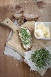 Keywords: cress green cress bread bread and butter bread butter wooden board cutting board country life close eat food
