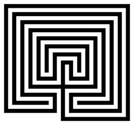 | Keywords: Cretan-labyrinth-square.svg One version of the ancient Cretan type of labyrinth made with straight lines only For the path through this labyrinth see File Cretan-labyrinth-square-path svg or File Cretan-labyrinth-square-path-traversal multicolor svg For other variants see File Cretan-labyrinth-half-round svg File Cretan-labyrinth-round svg File Cretan-labyrinth-round2 svg File Cretan-labyrinth-circular-disc svg and File Cretan-labyrinth-double svg Self-made graphic converted from the following vector PostScript source <pre> 300 396 translate 5 dup scale 25 setlinewidth 2 setlinecap /L lineto def -100 -100 moveto -300 -100 L -300 450 L 350 450 L 350 -150 L 50 -150 L 50 -50 L 250 -50 L 250 350 L -200 350 L -200 0 L 200 0 L 200 300 L -150 300 L -150 50 L -50 50 L -50 200 L 100 200 L 100 100 L stroke 100 -100 moveto 300 -100 L 300 400 L -250 400 L -250 -50 L -50 -50 L -50 -150 L -350 -150 L -350 500 L 400 500 L 400 -200 L 0 -200 L 0 150 L 50 150 L 50 50 L 150 50 L 150 250 L -100 250 L -100 100 L stroke showpage EOF</pre> 2009 AnonMoos v fl Graphic labyrinths Images with PostScript source code |