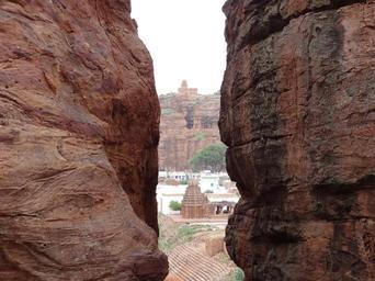Keywords: crevasse rocks hills sand stone red geology badami karnataka india
