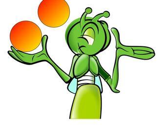 Keywords: cricket juggling cartoon insect alien green red orange balls juggle juggler