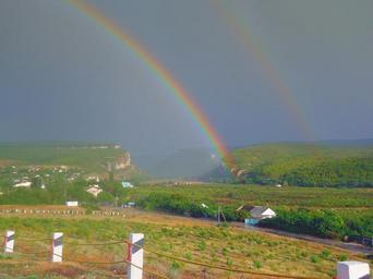 Keywords: crimea landscape scenic rainbow sky clouds buildings forest trees woods mountains valley nature outside summer spring country countryside