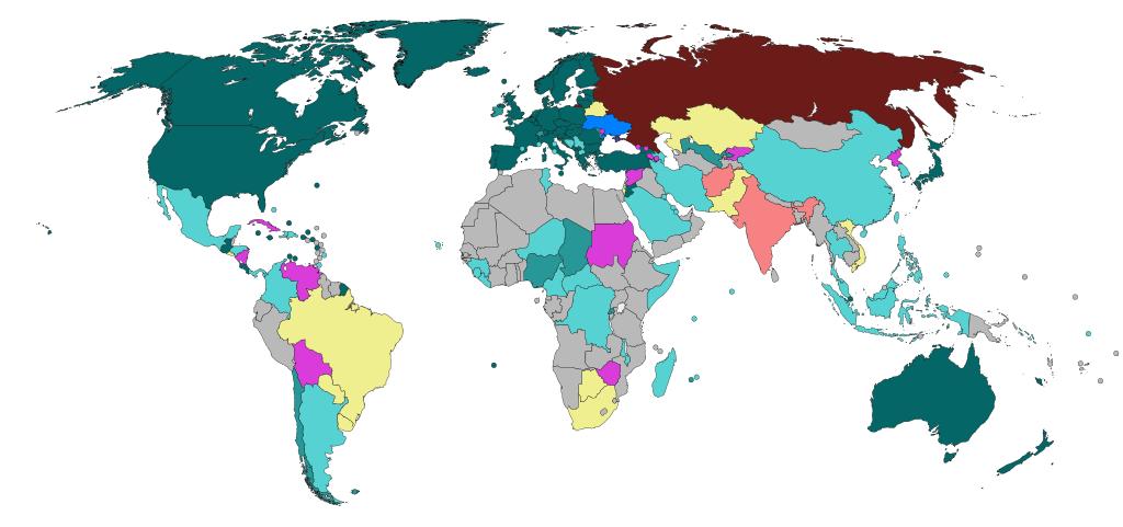 | Keywords: Crimea reaction clean.svg efef8f Statements only voicing concern or hope for peaceful resolution to the conflict 57d2d2 Support for Ukrainian territorial integrity 289797 Condemnation of Russian actions 1b6565 Condemnation of Russian actions as a military intervention or invasion d93cd9 Support for Russian actions and/or condemnation of the Ukrainian interim government f08080 Recognition of Russian and other interests of the conflict ---- 497bd7 Ukraine 6a1f1f Russia Note please do not change colors on the map without consensus on the talk page By changing the colors you'll make this map useless in 13 different language editions of Wikipedia because of the contradictions with the corresponding map legends Only official government statements are used of parliamentary ministerial and ambassadorial level Official positions of supranational organizations NATO EU etc used as positions of the corresponding countries unless they have a different individual position If an official position can be sorted in more than one category the strongest position was marked from the call for a peaceful resolution to interpretation as a military intervention consecutively In the case of contradictions between political actions like voting in the UN and political statements the category of the political action was used This is the international version of this map Sources <ref>http //www lithuaniatribune com/64476/lithuanian-polish-presidents-call-for-nato-treaty-article-4-consultations-201464476/</ref> <ref>http //www prezydent pl/aktualnosci/wydarzenia/art 2825 rola-polski-wskazywanie-ze-rosja-lamie-prawo-miedzynarodowe html</ref> <ref>http //eeas europa eu/statements/docs/2014/140301_01_en pdf</ref> <ref>http //www nato int/cps/en/natolive/opinions_107663 htm</ref> <ref>http //www nato int/cps/en/natolive/official_texts_107681 htm</ref> <ref>http //www smh com au/federal-politics/political-news/ukraine-tony-abbott-tells-russia-to-back-off-20140302-33tiy html</ref> <ref>http //www theaustralian com au/national-affairs/policy/tony-abbott-condemns-russias-unprovoked-aggression-in-ukraine/story-fn59nm2j-1226843267794</ref> <ref>http //president bg/news1762/announcement-of-the-press-secretariat html lang en</ref> <ref>http //president bg/news1763/announcement-of-the-press-secretariat-of-the-head-of-state html lang en</ref> <ref>http //www international gc ca/media/aff/news-communiques/2014/02/28a aspx lang eng</ref> <ref>http //www whitehouse gov/the-press-office/2014/03/01/readout-president-obama-s-calls-president-hollande-and-prime-minister-ha</ref> <ref>http //www cbc ca/news/world/ukraine-crisis-canada-u-s-tell-russia-to-withdraw-forces-1 2556228</ref> <ref>http //www fmprc gov cn/eng/xwfw/s2510/t1133558 shtml</ref> <ref>http //www dr dk/Nyheder/Indland/2014/03/02/121108 htm</ref> <ref>http //www vm ee/ q en/node/19307</ref> <ref>http //www suomenmaa fi/uutiset/tuomioja_ven C3 A4j C3 A4_toteuttaa_krimin_sotilaallista_haltuunottoa_6804086 html</ref> <ref>http //www ukrinform ua/ukr/news/frantsiya_vislovila_svoyu_sturbovanist_zagostrennyam_situatsiii_v_krimu_1912981</ref> <ref>http //www civil ge/eng/article php id 26995</ref> <ref>http //www spiegel de/politik/deutschland/krim-krise-merkel-wirft-putin-verstoss-gegen-voelkerrecht-vor-a-956514 html</ref> <ref>http //www news va/en/news/pope-angelus-appeal-for-ukraine-and-christian-frat</ref> <ref>http //www kormany hu/en/ministry-of-foreign-affairs/news/ministry-of-foreign-affairs-concerned-about-crimean-situation</ref> <ref>https //www dfa ie/news-and-media/press-releases/press-release-archive/2014/march/tanaiste-russian-federation-ukraine/</ref> <ref>http //www repubblica it/esteri/2014/03/02/news/ucraina_migliaia_di_soldati_russi_in_crimea_domani_timoshenko_al_cremlino-80002998/</ref> <ref>http //www japantoday com/category/politics/view/japan-expresses-concern-over-russias-ukraine-move</ref> <ref>http //www mfa gov lv/en/news/press-releases/2014/february/01-03-02/</ref> <ref>http //tvnz co nz/breakfast-news/pm-ukraine-pike-allegations-and-act-s-3-strikes-video-5855761</ref> <ref>http //www news24 com/SouthAfrica/News/SA-calls-for-peace-in-Ukraine-20140302</ref> <ref>http //www turkishweekly net/news/163800/turkey-closely-following-developments-in-crimea html</ref> <ref>http //www whitehouse gov/the-press-office/2014/02/28/statement-president-ukraine</ref> <ref>http //24tv ua/home/showSingleNews do sovet_es_trebuet_ot_rossii_nemedlenno_vivesti_voyska_iz_ukraini objectId 416316 lang ru</ref> <ref>http //armenianow com/news/52415/armenia_free_democrats_party_ukraine_statement</ref> <ref>http //www independent com mt/articles/2014-03-03/news/malta-condemns-recent-developments-in-crimea-4134895616/</ref> <ref>http //www president md/eng/comunicate-de-presa/pozitia-republicii-moldova-fata-de-situatia-din-ucraina</ref><ref>http //www sta si/vest php id 1985289 s s</ref> <ref>http //www iarex ru/articles/45744 html</ref> <ref>http //www rappler com/nation/52114-philippines-ukraine-dfa-possible-evacuation</ref> <ref>http //inserbia info/news/2014/03/albania-worries-that-situation-in-ukraine-may-destabilize-the-balkans/</ref> <ref>http //www laestrella com pa/online/noticias/2014/03/03/ucrania-rusia-crimea-canciller-panameno-201903 asp</ref> <ref>http //russian irib ir/news/iran1/item/200300-q-q</ref> <ref>http //www mofa gov vn/en/tt_baochi/pbnfn/ns140306110607</ref> <ref>http //www cancilleria gov co/newsroom/news/comunicado-del-ministerio-relaciones-exteriores-sobre-la-situacion-ucrania</ref> <ref>http //www timesofisrael com/breaking-silence-israel-urges-diplomacy-in-ukraine/</ref> <ref>http //timesofindia indiatimes com/india/Russian-interests-in-Crimea-legitimate-India/articleshow/31557852 cms</ref> <ref>http //timesofindia indiatimes com/india/India-not-to-support-western-sanctions-against-Russia/articleshow/32307749 cms</ref> <ref>http //www nation com pk/national/06-Mar-2014/pakistan-urges-peaceful-end-to-ukraine-crisis</ref> <ref>http //www glo