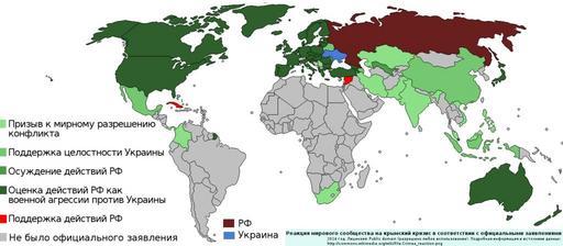 | Keywords: Crimea reaction.png Crimea reaction clean svg здесь Источники <ref>http //www lithuaniatribune com/64476/lithuanian-polish-presidents-call-for-nato-treaty-article-4-consultations-201464476/</ref> <ref>http //www prezydent pl/aktualnosci/wydarzenia/art 2825 rola-polski-wskazywanie-ze-rosja-lamie-prawo-miedzynarodowe html</ref> <ref>http //eeas europa eu/statements/docs/2014/140301_01_en pdf</ref> <ref>http //www nato int/cps/en/natolive/opinions_107663 htm</ref> <ref>http //www nato int/cps/en/natolive/official_texts_107681 htm</ref> <ref>http //www smh com au/federal-politics/political-news/ukraine-tony-abbott-tells-russia-to-back-off-20140302-33tiy html</ref> <ref>http //www theaustralian com au/national-affairs/policy/tony-abbott-condemns-russias-unprovoked-aggression-in-ukraine/story-fn59nm2j-1226843267794</ref> <ref>http //president bg/news1762/announcement-of-the-press-secretariat html lang en</ref> <ref>http //president bg/news1763/announcement-of-the-press-secretariat-of-the-head-of-state html lang en</ref> <ref>http //www international gc ca/media/aff/news-communiques/2014/02/28a aspx lang eng</ref> <ref>http //www whitehouse gov/the-press-office/2014/03/01/readout-president-obama-s-calls-president-hollande-and-prime-minister-ha</ref> <ref>http //www cbc ca/news/world/ukraine-crisis-canada-u-s-tell-russia-to-withdraw-forces-1 2556228</ref> <ref>http //www fmprc gov cn/eng/xwfw/s2510/t1133558 shtml</ref> <ref>http //www dr dk/Nyheder/Indland/2014/03/02/121108 htm</ref> <ref>http //www vm ee/ q en/node/19307</ref> <ref>http //www suomenmaa fi/uutiset/tuomioja_ven C3 A4j C3 A4_toteuttaa_krimin_sotilaallista_haltuunottoa_6804086 html</ref> <ref>http //www ukrinform ua/ukr/news/frantsiya_vislovila_svoyu_sturbovanist_zagostrennyam_situatsiii_v_krimu_1912981</ref> <ref>http //www civil ge/eng/article php id 26995</ref> <ref>http //www spiegel de/politik/deutschland/krim-krise-merkel-wirft-putin-verstoss-gegen-voelkerrecht-vor-a-956514 html</ref> <ref>http //www news va/en/news/pope-angelus-appeal-for-ukraine-and-christian-frat</ref> <ref>http //www kormany hu/en/ministry-of-foreign-affairs/news/ministry-of-foreign-affairs-concerned-about-crimean-situation</ref> <ref>https //www dfa ie/news-and-media/press-releases/press-release-archive/2014/march/tanaiste-russian-federation-ukraine/</ref> <ref>http //www repubblica it/esteri/2014/03/02/news/ucraina_migliaia_di_soldati_russi_in_crimea_domani_timoshenko_al_cremlino-80002998/</ref> <ref>http //www japantoday com/category/politics/view/japan-expresses-concern-over-russias-ukraine-move</ref> <ref>http //www mfa gov lv/en/news/press-releases/2014/february/01-03-02/</ref> <ref>http //tvnz co nz/breakfast-news/pm-ukraine-pike-allegations-and-act-s-3-strikes-video-5855761</ref> <ref>http //www news24 com/SouthAfrica/News/SA-calls-for-peace-in-Ukraine-20140302</ref> <ref>http //www turkishweekly net/news/163800/turkey-closely-following-developments-in-crimea html</ref> <ref>http //www whitehouse gov/the-press-office/2014/02/28/statement-president-ukraine</ref> <ref>http //24tv ua/home/showSingleNews do sovet_es_trebuet_ot_rossii_nemedlenno_vivesti_voyska_iz_ukraini objectId 416316 lang ru</ref> <ref>http //armenianow com/news/52415/armenia_free_democrats_party_ukraine_statement</ref> <ref>http //www independent com mt/articles/2014-03-03/news/malta-condemns-recent-developments-in-crimea-4134895616/</ref> <ref>http //www president md/eng/comunicate-de-presa/pozitia-republicii-moldova-fata-de-situatia-din-ucraina</ref><ref>http //www sta si/vest php id 1985289 s s</ref> <ref>http //www iarex ru/articles/45744 html</ref> <ref>http //www rappler com/nation/52114-philippines-ukraine-dfa-possible-evacuation</ref> <ref>http //www mofa gov vn/en/tt_baochi/pbnfn/ns140306110607</ref> <ref>http //www cancilleria gov co/newsroom/news/comunicado-del-ministerio-relaciones-exteriores-sobre-la-situacion-ucrania</ref> <ref>http //www laestrella com pa/online/noticias/2014/03/03/ucrania-rusia-crimea-canciller-panameno-201903 asp</ref> <ref>http //russian irib ir/news/iran1/item/200300-q-q</ref> <ref>http //www mofa gov vn/en/tt_baochi/pbnfn/ns140306110607</ref> <ref>http //www cancilleria gov co/newsroom/news/comunicado-del-ministerio-relaciones-exteriores-sobre-la-situacion-ucrania</ref> <ref>http //www timesofisrael com/breaking-silence-israel-urges-diplomacy-in-ukraine/</ref> <ref>http //timesofindia indiatimes com/india/Russian-interests-in-Crimea-legitimate-India/articleshow/31557852 cms</ref> <ref>http //www nation com pk/national/06-Mar-2014/pakistan-urges-peaceful-end-to-ukraine-crisis</ref> <ref>http //www globaltimes cn/content/846829 shtml Uxlz_bFYWSo</ref> <ref>http //www kln gov my/web/guest/home p_p_id 101_INSTANCE_Yt06 p_p_lifecycle 0 p_p_state normal p_p_mode view p_p_col_id column-3 p_p_col_pos 1 p_p_col_count 5 _101_INSTANCE_Yt06_struts_action 2Fasset_publisher 2Fview_content _101_INSTANCE_Yt06_urlTitle press-statement-by-minister-of-foreign-affairs-on-developments-in-ukraine-5-march-2014-kenyataan-akhbar 3A-perkembangan-di-ukraine-5-mac-2014 _101_INSTANCE_Yt06_type content redirect 2Fweb 2Fguest 2Fhome</ref> <ref>http //www sre gob mx/en/index php/archived-press-releases/2382-mexico-expresses-its-deep-concern-at-the-deteriorating-situation-in-ukraine</ref> <ref>http //inserbia info/news/2014/03/serbian-mfa-advises-citizens-to-avoid-trips-to-ukraine/</ref> <ref>http //vz ru/news/2014/3/18/677684 html</ref> en World reaction on the 2014 Crimea crisis Brown - Russia Blue - Ukraine salad green - for peaceful solution of the conflict Light green - support of the Ukraine territorial integrity Green - condemnation of the Russian actions Dark green - interpretation of the Russian actions as a military intervention Red - support of the Russian actions 2014-03-03 18 22 50 own Zhitelew References reflist cc-zero Uploaded with UploadWizard Maps of the international reaction to the Annexation of Crimea by the Russian Federation Imag