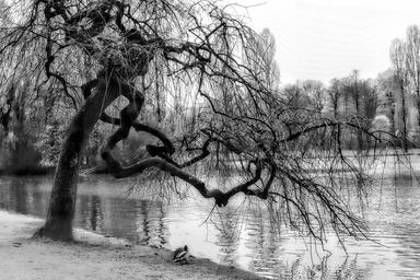 Keywords: crippled stunted tree lake pond water black and white ducks animals park