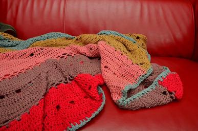 Keywords: crochet blanket sofa couch blanket hand labor sit cozy colorful red after work rest seating area relax
