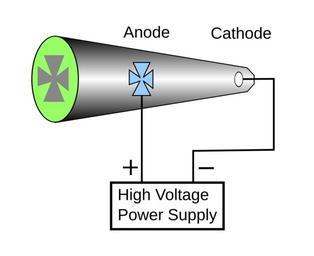 | Keywords: Crookes tube diagram.svg Diagram of Crookes tube an experimental discharge tube invented by William Crookes around 1875 The power supply applies a voltage of several thousand volts between the two electrodes Electrons cathode rays released from the cathode plate are accelerated down the tube to the left toward the anode and strike the end wall which fluoresces The Maltese cross shaped anode blocks the electrons casting a shadow on the glowing end wall demonstrating that the cathode rays travel in straight lines The electrons eventually make their way to the anode travel up the anode wire through the power supply and back to the cathode Drawing made with Inkscape Schema del tubo di Crookes Zeichnung einer Schattenkreuzröhre nach Bauart der englischen Wikipedia Own 5/3/08 Chris Burks Chetvorno I Chris Burks release this drawing into the public domain for any use whatever Image Crookes tube2 diagram svg shows an alternate circuit using a separate anode electrode where the cross is not connected to the power supply References cite book Per F Dahl 1997 Flash of the Cathode Rays A History of J J Thomson's Electron CRC Press 72 0750304537 Crookes tube |
