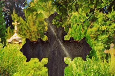 | Keywords: cross metal cross cemetery religion symbol faith christian christianity metal blacksmithing historically rusty antique stainless rusted grave tomb incidence of light sunlight sunbeam weathered decay ailing corrosion nostalgia verrostentrauer die died leaves trees green death |
