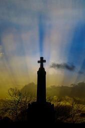Keywords: cross monument religion jesus architecture sky sunset yellow blue cloudy cloud weather evening tree trees branch without leaves autumn