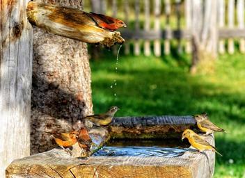 Keywords: crossbills loxia finch bird water drink clean wild bird plumage feather colorful color food