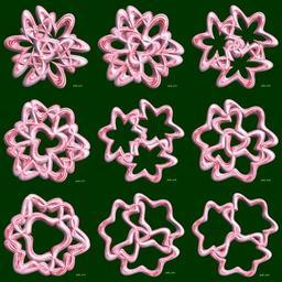 | Keywords: mathematica 3d cg parametricplot3d texture torus 輪環 りんかん ドーナツ どーなつ 六芒星 ろくぼうせい 六光星 ろくこうせい 六稜星 ろくりょうせい プログラム コード code program algorithm コード アルゴリズム hexagram geometric sculpture geometricsculpture shape geometry sculpture mapping テクスチャ マッピング 模様 もよう abstract 抽象 ちゅうしょう アブストラクト design pattern デザイン パターン graphic グラフィック グラフィクス structure 意匠 構造 symmetry 対称性 たいしょうせい シンメトリー 対称 たいしょう algorithm plant blossom flower outdoor a = 6;(* center hole size of a torus *) b = 6;(* hexa-torus *) c = 4;(* distance from the center of rotation *) d = 3;(* number of torus *) SetOptions[ParametricPlot3D, PlotRange -> Full, Mesh -> None, Boxed -> False, Axes -> None, PlotPoints -> 200, ImageSize -> 1200, Background -> Darker[Green, 0.8], PlotStyle -> Directive[Specularity[White, 50], Texture[Import["D:/tmp/86.jpg"]]], TextureCoordinateFunction -> ({#4 , #5} &), Lighting -> "Neutral"]; x = (a - Cos[t] - Sin[b s]) Cos[s + Pi/(2 b)] + c; y = Sin[t] + c; z = (a - Cos[t] - Sin[b s]) Sin[s] + c; rot = Table[{x, y, z}.RotationMatrix[2 i Pi/d, {0, 1, 0}], {i, d}]; ParametricPlot3D[rot, {t, 0, 2 Pi}, {s, 0, 2 Pi}] (*--- The Texture *) a = 6;(* center hole size of a torus *) b = 6;(* hexa-torus *) c = 4;(* distance from the center of rotation *) d = 3;(* number of torus *) SetOptions[ParametricPlot3D, PlotRange -> Full, Mesh -> None, Boxed -> False, Axes -> None, PlotPoints -> 200, ImageSize -> 1200, Background -> Darker[Green, 0.8], PlotStyle -> Directive[Specularity[White, 50], Texture[Import["D:/tmp/86.jpg"]]], TextureCoordinateFunction -> ({#4 , #5} &), Lighting -> "Neutral"]; x = (a - Cos[t] - Sin[b s]) Cos[s + Pi/(2 b)] + c; y = Sin[t] + c; z = (a - Cos[t] - Sin[b s]) Sin[s] + c; rot = Table[{x, y, z}.RotationMatrix[2 i Pi/d, {0, 1, 0}], {i, d}]; ParametricPlot3D[rot, {t, 0, 2 Pi}, {s, 0, 2 Pi}] (*--- The Texture *) |