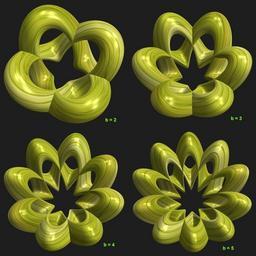 | Keywords: mathematica 3d cg parametricplot3d texture torus code program algorithm プログラム コード アルゴリズム 輪環 りんかん ドーナツ どーなつ bamboo 竹 たけ タケ geometric sculpture geometricsculpture shape geometry sculpture mapping テクスチャ マッピング 模様 もよう abstract 抽象 ちゅうしょう アブストラクト design pattern デザイン パターン graphic グラフィック グラフィクス structure 意匠 構造 symmetry 対称性 たいしょうせい シンメトリー 対称 たいしょう black background indoor organic pattern bright a = 3; (* center hole size *) b = 5; (* penta-torus *) c = 0; (* distance from the center of rotation *) d = 2; (* number of torus *) h = 2; (* height of a torus *) SetOptions[ParametricPlot3D, PlotRange -> Full, Mesh -> None, Boxed -> False, Axes -> False, PlotPoints -> 400, ImageSize -> 1600, Background -> RGBColor[{30, 30, 30}/255], PlotStyle -> Directive[Specularity[White, 90], Texture[Import["D:/tmp/71.jpg"]]], TextureCoordinateFunction -> ({#4 + #5, #5 / Pi} &), Lighting -> "Neutral"]; x = (a - Cos[t] - Sin[b s]) Cos[s]; y = (a - Cos[t] - Sin[b s]) Abs[Sin[s]] + c; z = (a - Sin[t] - h Sin[b s]); rm = Table[{x, y, z}.RotationMatrix[2 i Pi/d, {0, 0, 1}], {i, d}]; ParametricPlot3D[rm, {t, 0, 2 Pi}, {s, 0, 2 Pi}] (*--- The Texture *) a = 3; (* center hole size *) b = 5; (* penta-torus *) c = 0; (* distance from the center of rotation *) d = 2; (* number of torus *) h = 2; (* height of a torus *) SetOptions[ParametricPlot3D, PlotRange -> Full, Mesh -> None, Boxed -> False, Axes -> False, PlotPoints -> 400, ImageSize -> 1600, Background -> RGBColor[{30, 30, 30}/255], PlotStyle -> Directive[Specularity[White, 90], Texture[Import["D:/tmp/71.jpg"]]], TextureCoordinateFunction -> ({#4 + #5, #5 / Pi} &), Lighting -> "Neutral"]; x = (a - Cos[t] - Sin[b s]) Cos[s]; y = (a - Cos[t] - Sin[b s]) Abs[Sin[s]] + c; z = (a - Sin[t] - h Sin[b s]); rm = Table[{x, y, z}.RotationMatrix[2 i Pi/d, {0, 0, 1}], {i, d}]; ParametricPlot3D[rm, {t, 0, 2 Pi}, {s, 0, 2 Pi}] (*--- The Texture *) |