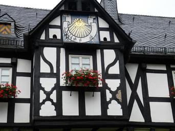 Keywords: crottorf castle moated castle architecture romance water places of interest truss fachwerkhaus facade building bar construction wood home clock sundial geranium slate