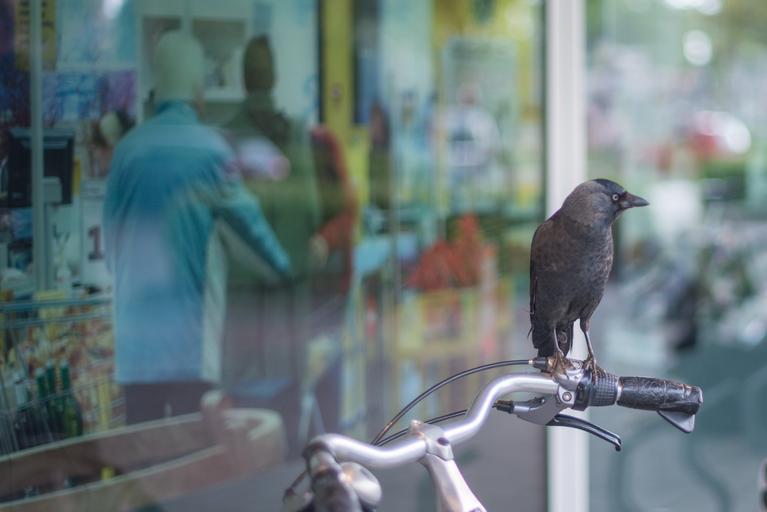 Keywords: crow bicycle shop window people reflection sitting walking sidewalk street town