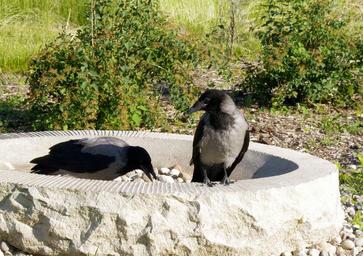 Keywords: crow crows bird nature predator ornithology sky blue bird feeding tray closeup gray gray black park city animals urban birds pebbles