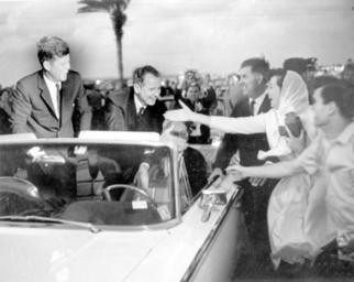 | Keywords: florida state library and archives of florida statelibraryandarchivesofflorida presidents laughter laughing world laughter day worldlaughterday president kennedy presidentkennedy politics handshakes president john f. kennedy presidentjohnfkennedy john f. kennedy johnfkennedy john kennedy johnkennedy kennedy jfk democrat democratic party democraticparty george smathers georgesmathers smathers blackandwhite monochrome black and white Local call number: Rc09172 Personal Author: Rimkus, Joe. Title: [Crowd greeting President John F. Kennedy in Miami, Florida] Publication info: 1963. Physical descrip: 1 photoprint; b&w; 8 x 10 in. Series Title: (Reference Collection) General Note: Riding with the President is U.S. Senator George Smathers. Photographed: November 18, 1963. Repository: State Library and Archives of Florida, 500 S. Bronough St., Tallahassee, FL 32399-0250 USA. Contact: 850.245.6700. Archives@dos.state.fl.us Persistent URL: www.floridamemory.com/items/show/32023 Local call number: Rc09172 Personal Author: Rimkus, Joe. Title: [Crowd greeting President John F. Kennedy in Miami, Florida] Publication info: 1963. Physical descrip: 1 photoprint; b&w; 8 x 10 in. Series Title: (Reference Collection) General Note: Riding with the President is U.S. Senator George Smathers. Photographed: November 18, 1963. Repository: State Library and Archives of Florida, 500 S. Bronough St., Tallahassee, FL 32399-0250 USA. Contact: 850.245.6700. Archives@dos.state.fl.us Persistent URL: www.floridamemory.com/items/show/32023 |