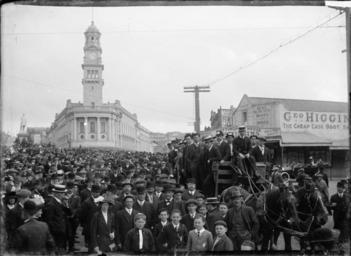 | Keywords: blackandwhite monochrome outdoor black and white View of Auckland Town Hall taken from Queen Street with the statue of Sir George Grey on the left and Grey Street on the right. A large crowd is gathered and all are looking towards the photographer. On the right is a horse and cart with a number of young men standing on board, some with cards in their hatbands. The reason for the gathering is not indicated but it may have been to listen to speeches by a politican or trade unionist. The business premises of George Higgins, bootmaker can be seen on the right behind the crowd. Photograph taken by William A Price, ca 1912-1914. Inscriptions: Inscribed - Photographer's title on negative -bottom centre: Grey's statue and Town Hall. Auckland. 105E [?]. William Archer Price lived and practised in Queen Street, Northcote, 1909-1910. Source: New Zealand Post Office directories Quantity: 1 b&w original negative(s). Physical Description: Dry plate glass negative 4.75 x 6.5 inches Crowd in Queen Street near the Auckland Town Hall. Price, William Archer, 1866-1948 :Collection of post card negatives. Ref: 1/2-001652-G. Alexander Turnbull Library, Wellington, New Zealand. natlib.govt.nz/records/22325007 View of Auckland Town Hall taken from Queen Street with the statue of Sir George Grey on the left and Grey Street on the right. A large crowd is gathered and all are looking towards the photographer. On the right is a horse and cart with a number of young men standing on board, some with cards in their hatbands. The reason for the gathering is not indicated but it may have been to listen to speeches by a politican or trade unionist. The business premises of George Higgins, bootmaker can be seen on the right behind the crowd. Photograph taken by William A Price, ca 1912-1914. Inscriptions: Inscribed - Photographer's title on negative -bottom centre: Grey's statue and Town Hall. Auckland. 105E [?]. William Archer Price lived and practised in Queen Street, Northcote, 1909-1910. Source: New Zealand Post Office directories Quantity: 1 b&w original negative(s). Physical Description: Dry plate glass negative 4.75 x 6.5 inches Crowd in Queen Street near the Auckland Town Hall. Price, William Archer, 1866-1948 :Collection of post card negatives. Ref: 1/2-001652-G. Alexander Turnbull Library, Wellington, New Zealand. natlib.govt.nz/records/22325007 |