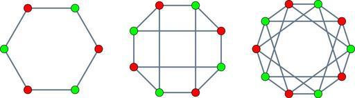 Keywords: Crown graphs.svg Crown graphs with six eight and ten vertices Own David Eppstein 2008-01-12 See also Crown graphs 2 svg for a representation of the same graphs as bipartite graphs Files by User David Eppstein from en wikipedia Crown graph 5 Cube graph Cycle graph 6