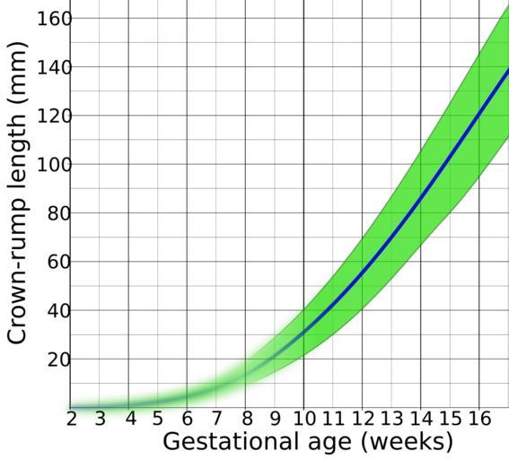 | Keywords: Crown-rump length by gestational age (vector).svg Crown-rump length by gestational age The blue line is the mean and the green area delimits the 3rd versus the 97th percentile cite journal Ohuma EO Papageorghiou AT Villar J Altman DG Estimation of gestational age in early pregnancy from crown-rump length when gestational age range is truncated the case study of the INTERGROWTH-21st Project BMC Med Res Methodol 13 151 2013 24314232 4029763 10 1186/1471-2288-13-151 <P>Crown rump length before a gestational age of 9 weeks is extrapolated by assuming a crown rump length of 0 at a gestational age of 2 weeks corresponding to a fertilization age of 0 weeks This extrapolated part is blurred because of uncertain values Mikael Häggström 2014-07-12 thumb left png-format Obstetrics Cc-zero |