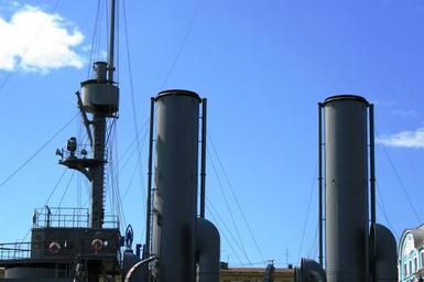Keywords: cruiser russian war vessel museum smoke stacks rigging crow's nest sky blue