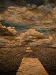 Keywords: crumpled old faded paper past transient road sky clouds yellow central reservation asphalt transience nature